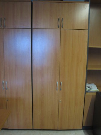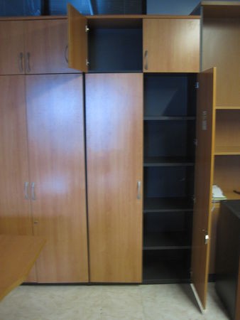 Armario alto de 2300 de altura, 920 de ancho y 400 de fondo, 4 estantes, maletero en la parte superior del armario, puertas altas, todo en melamina color peral-negro.