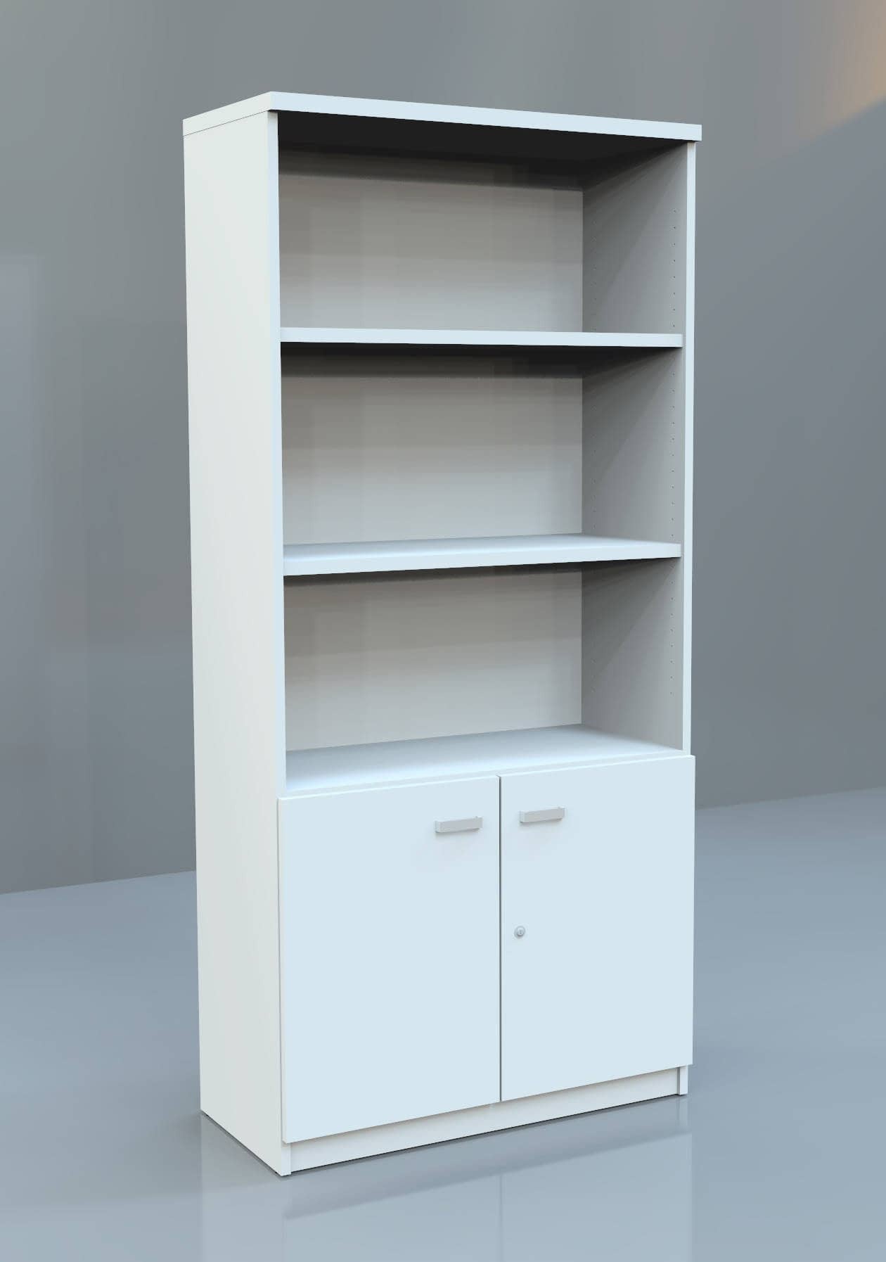 Armario alto de 1960 de altura, 900 de ancho y 423 de fondo, con puertas bajas, formado por laterales y zócalo con nivelador de altura de tablero melamínico de 19 mm de espesor, techo y estantes de 25 mm, color a elegir dentro de nuestra carta de acabados.