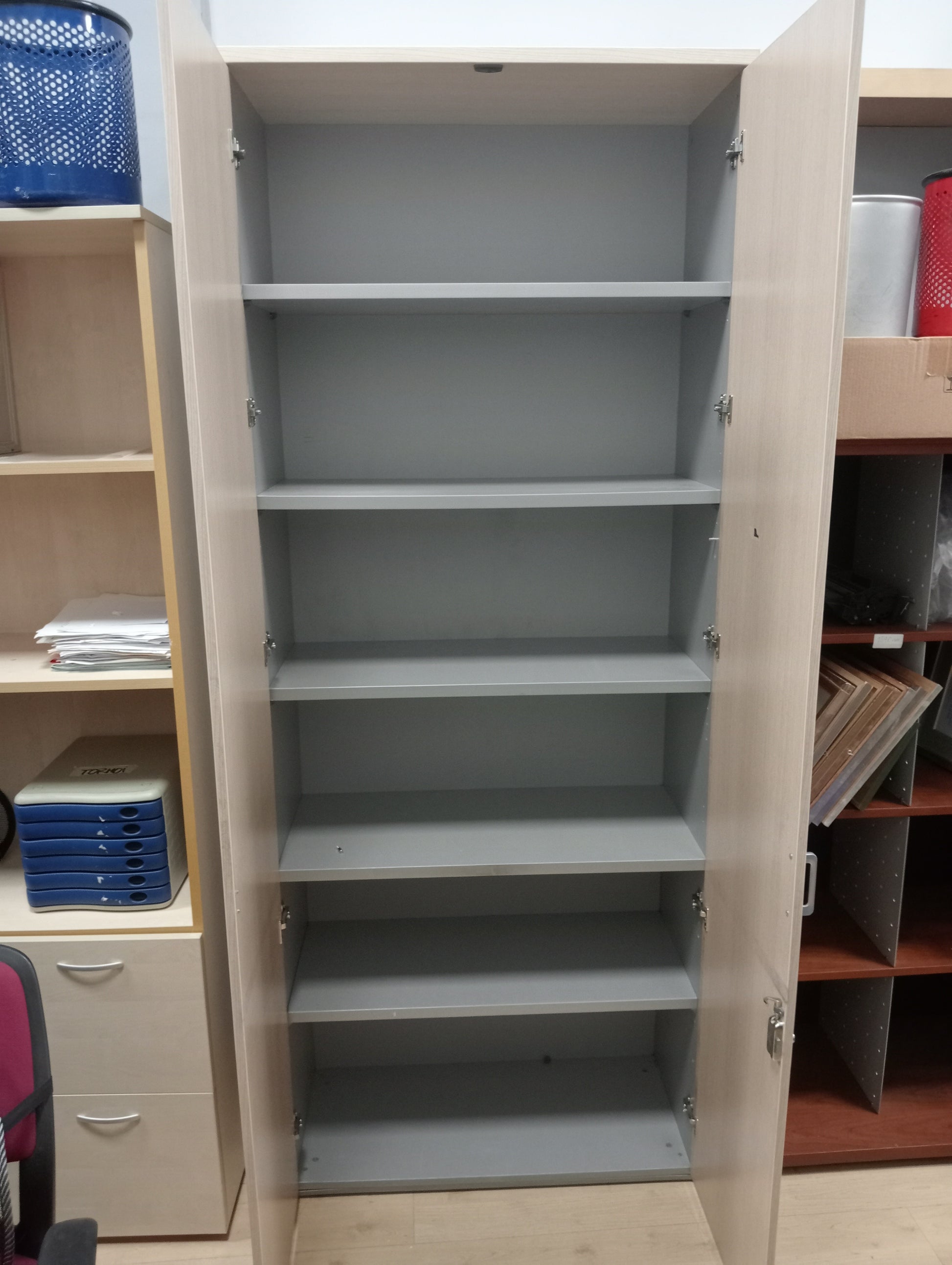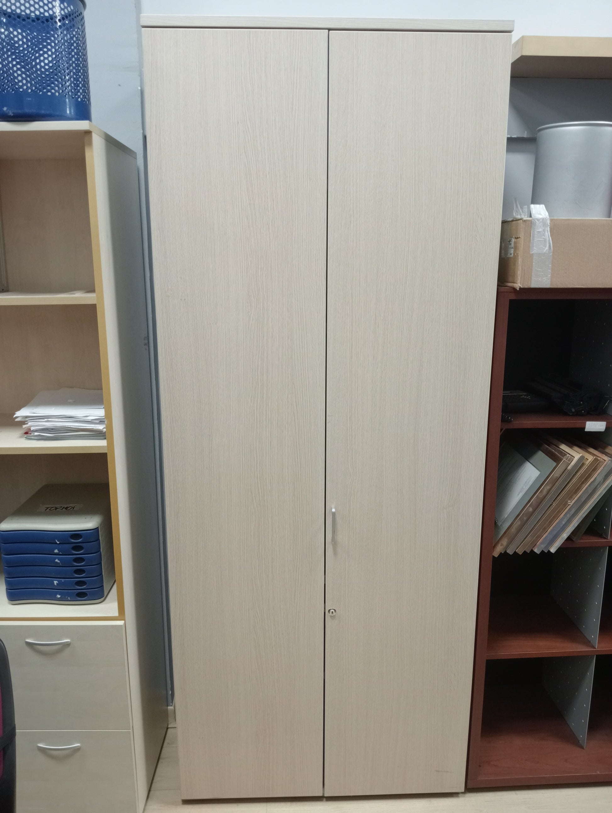 Armario alto, de 2220 de altura, 890 de ancho y 420 de fondo, con puertas altas, estantes de 3 cm de grosor, todo en melamina color haya - gris aluminio. Mesas disponibles a juego.