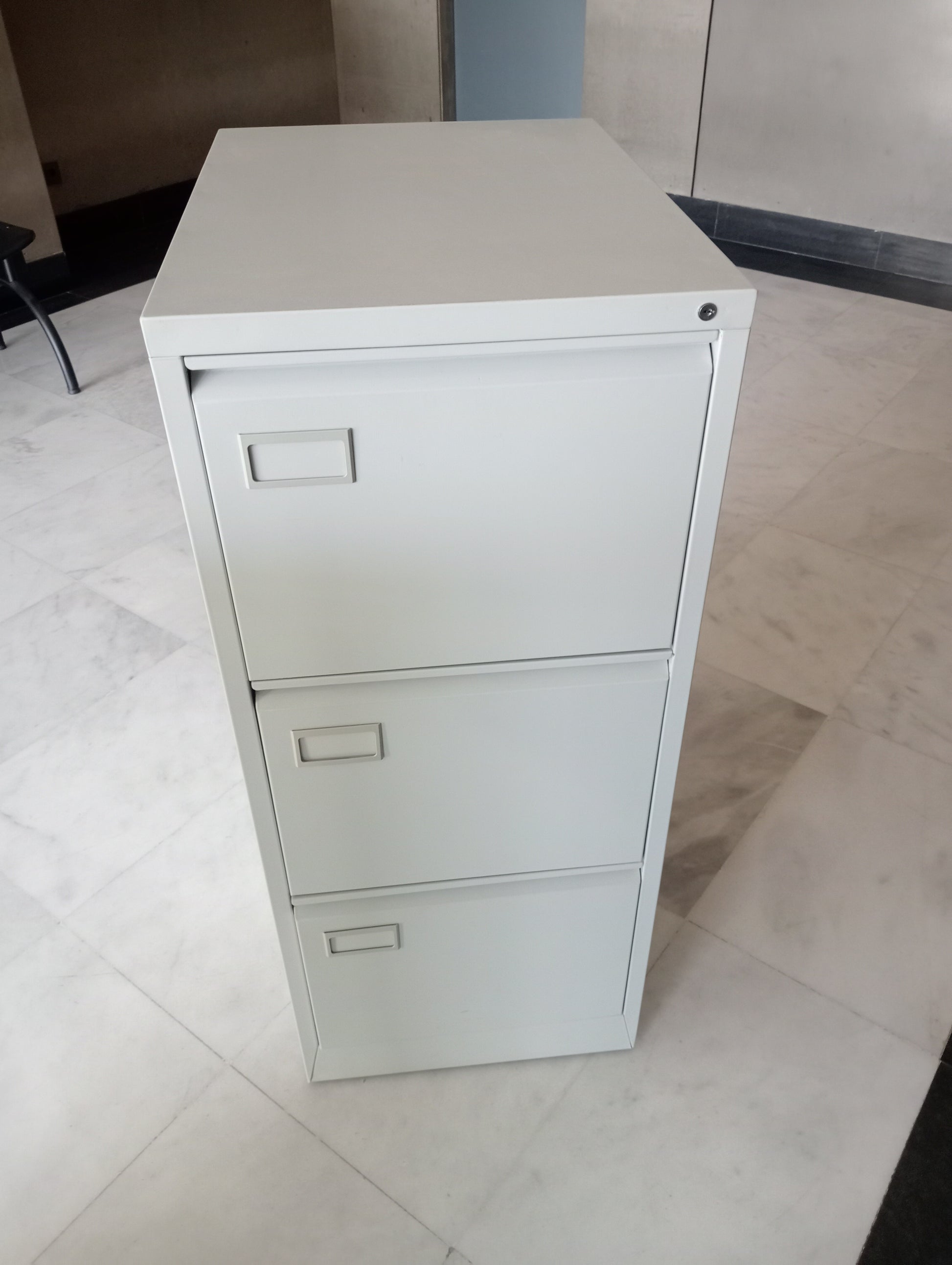 Armario archivador de 108 de altura, 46 de ancho y 62 de fondo, con 3 cajones, sistema antivuelco, todo metálico pintado en epoxi gris.