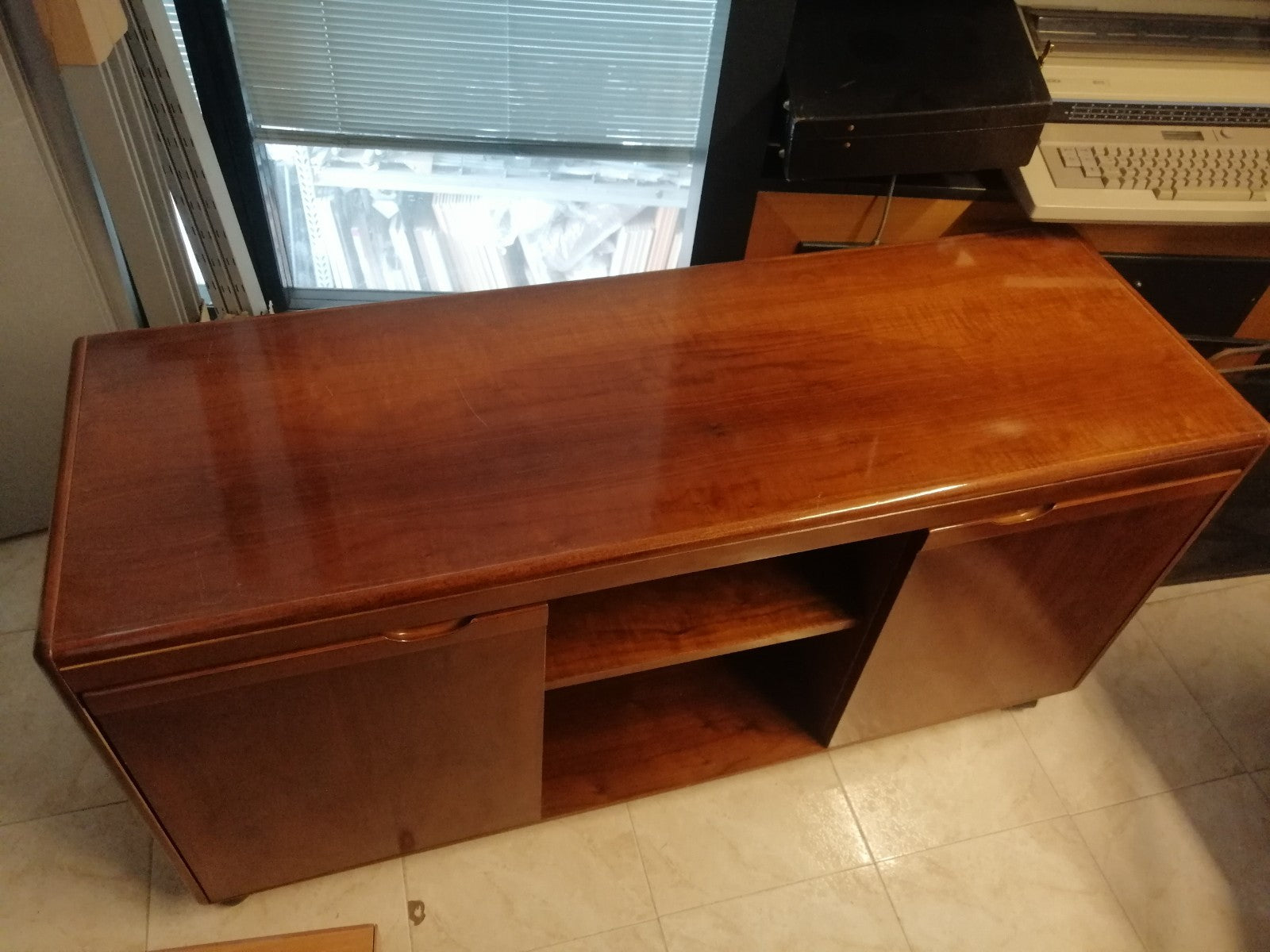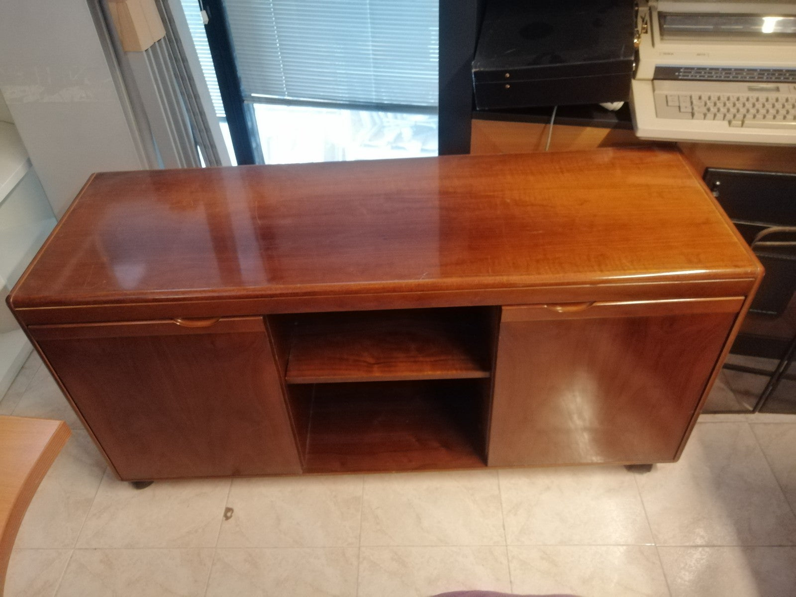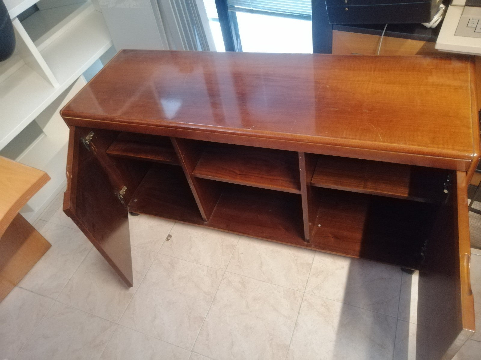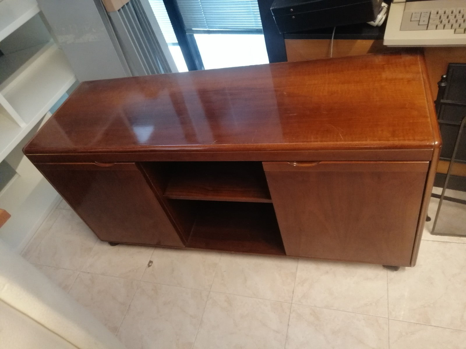 Armario bajo con ruedas, de 660 de altura, 1350 de ancho y 450 de fondo, con puertas, estantes, todo en madera color nogal.