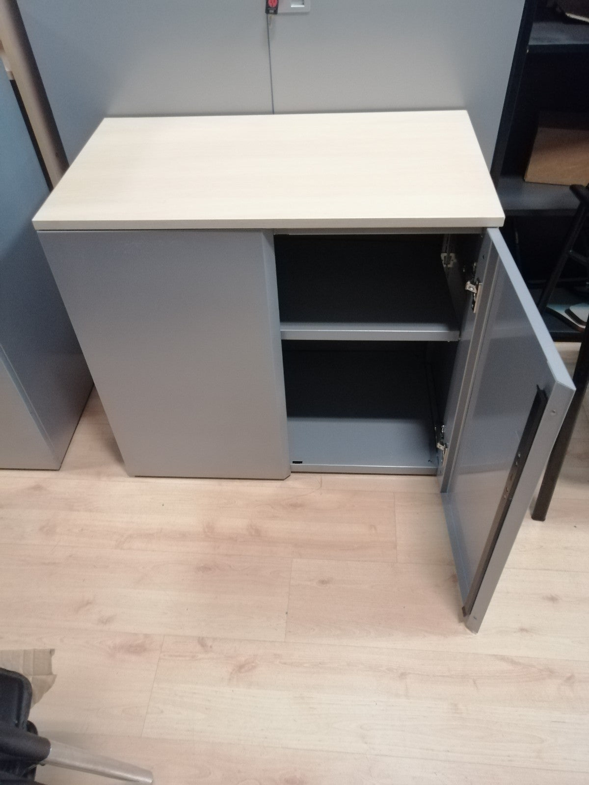 Armario bajo metálico de 740 de altura, 800 de ancho y 450 de fondo, con puertas altas, 1 estante intermedio, todo metálico pintado en epoxi gris, encimera de melamina color haya.