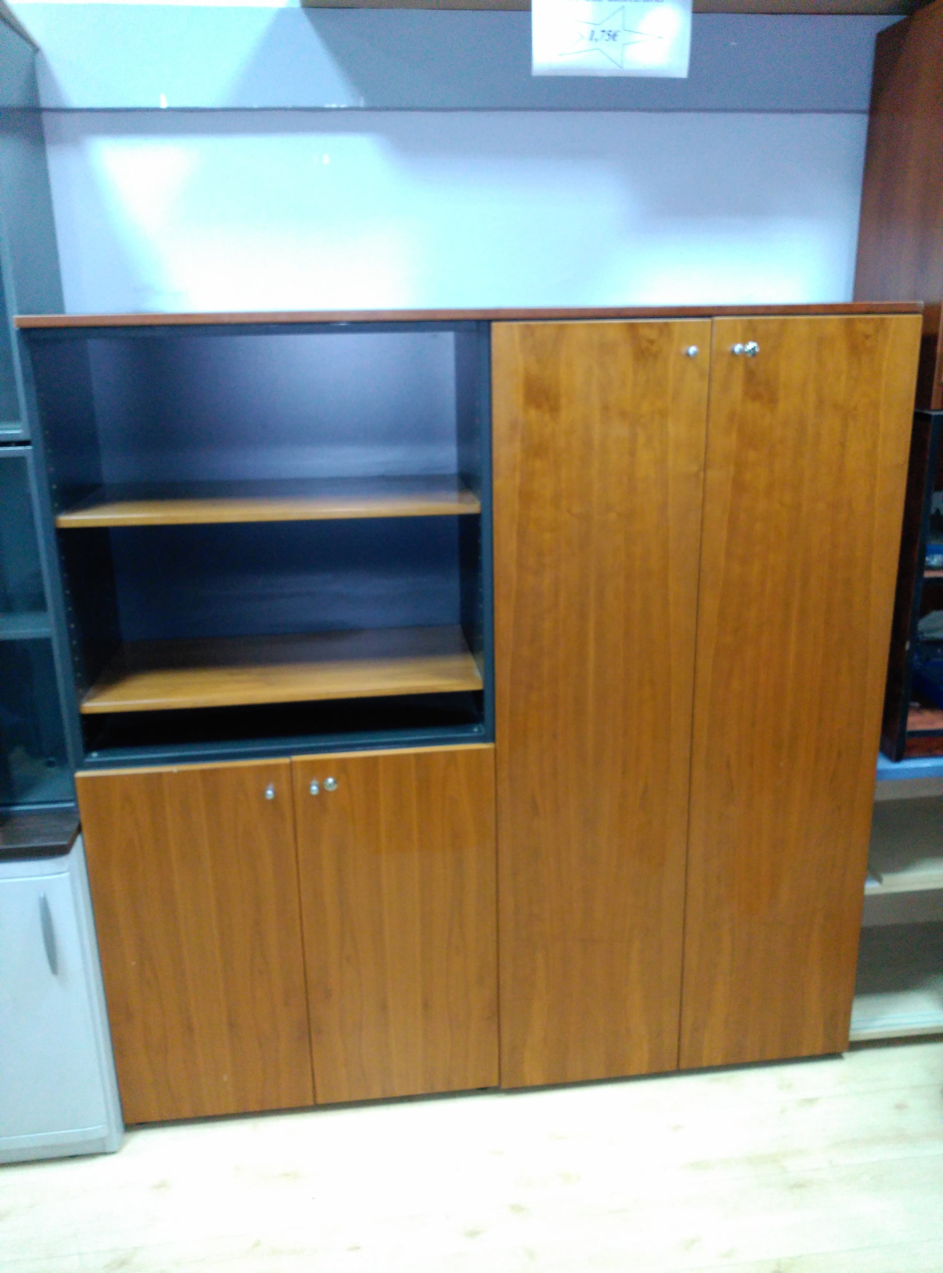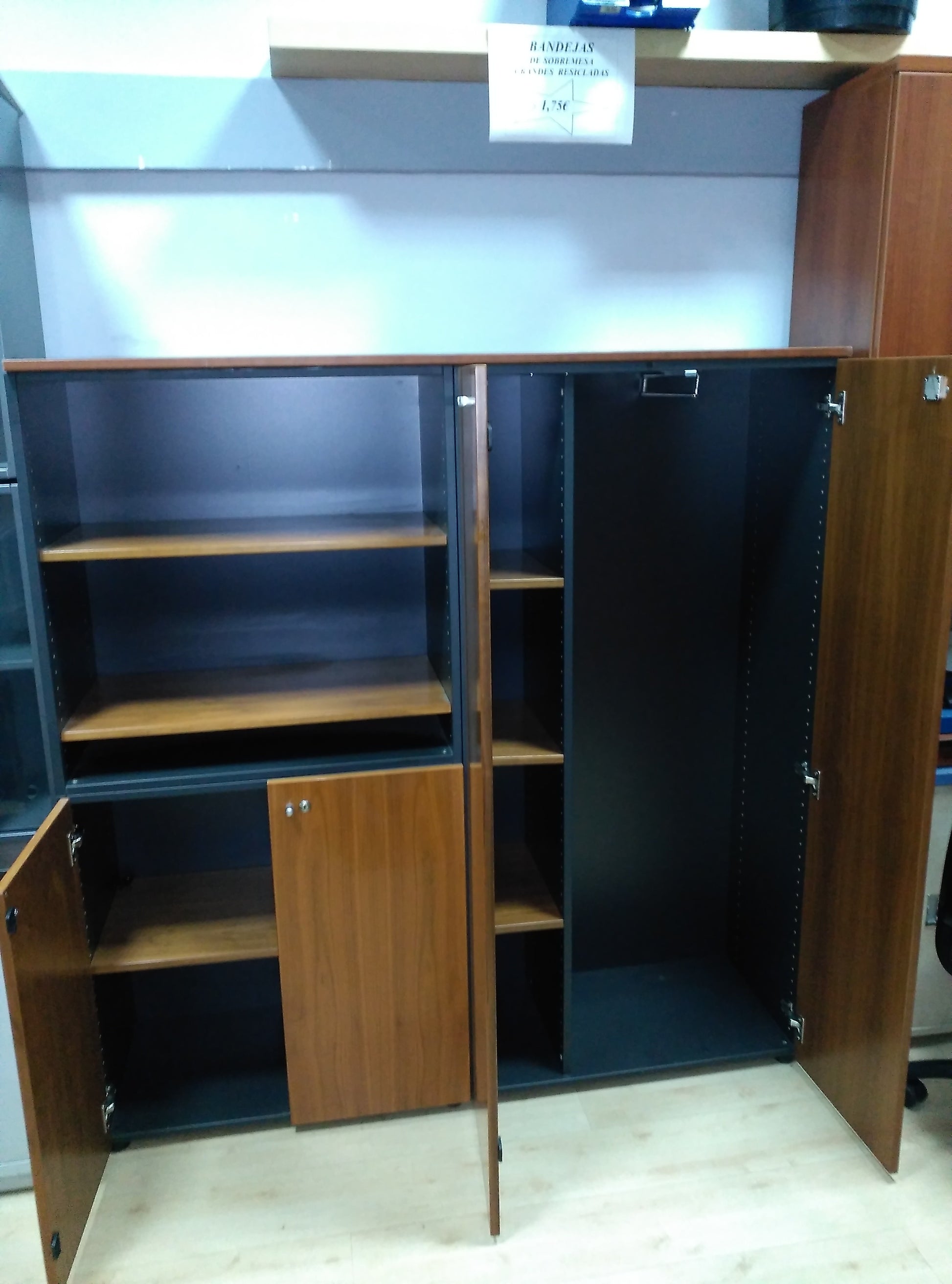 Armarios unidos con longitud total de 1600, altura total 1650 y fondo de 450, formado por dos armarios unidos uno de puertas altas y otro de puertas bajas, todo en madera barnizada color nogal y costados en color grafito.