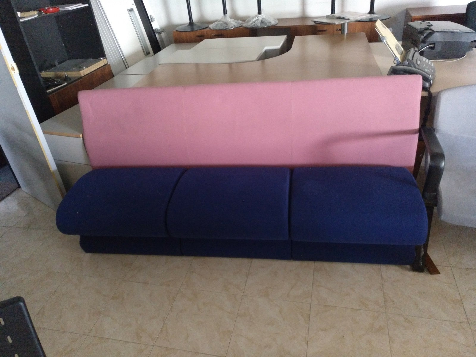 Bancada de 3 plazas de 1800 de longitud y 600 de fondo, tapizado en aran azul-rosa.