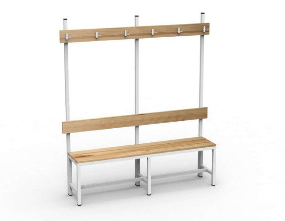 Banco de vestuario con percha, fabricado en chasis de tubo de 30x30 de acero laminado frio de gran resistencia, estructura soldada. Las lamas son de madera natural barnizado.