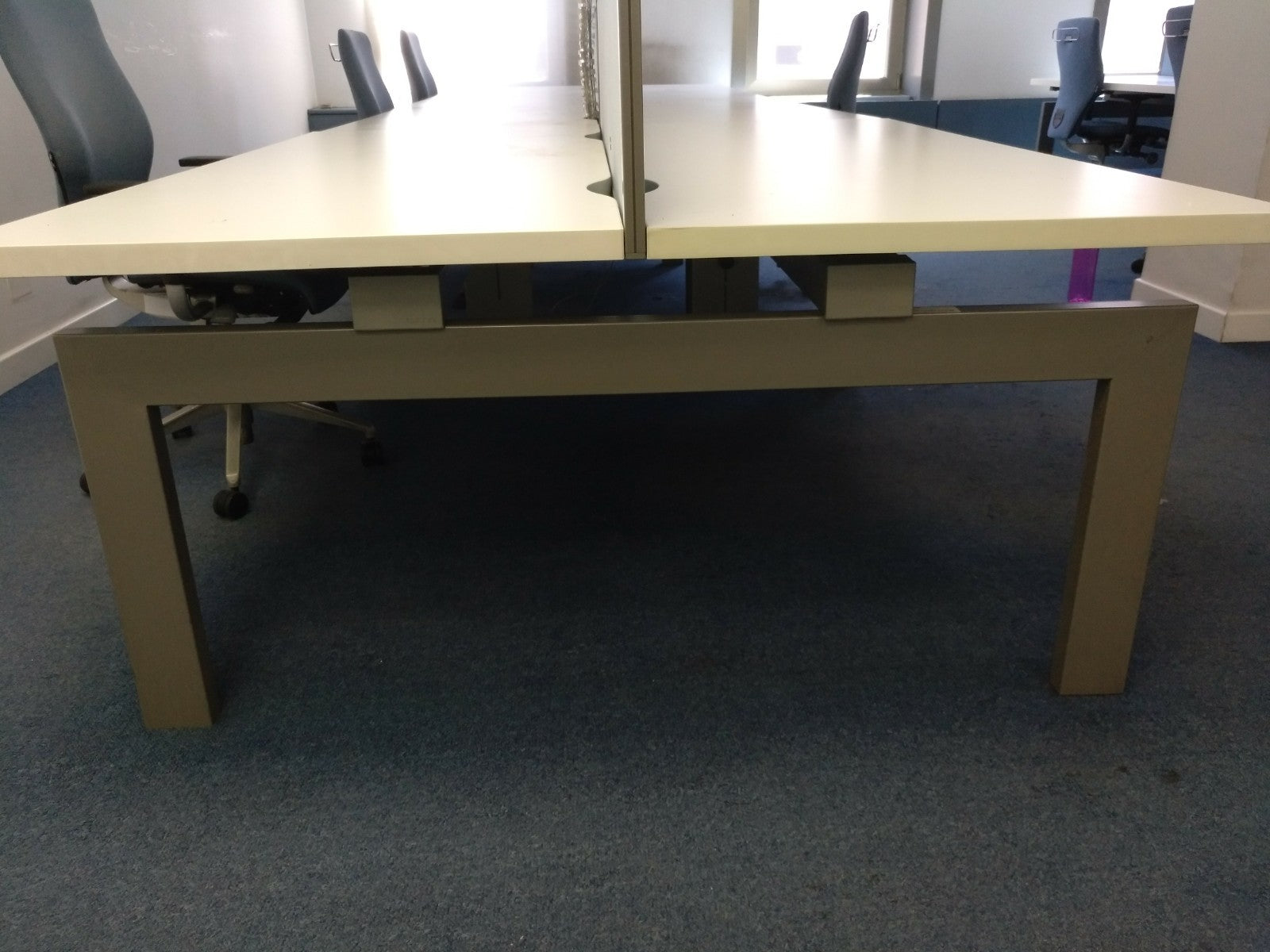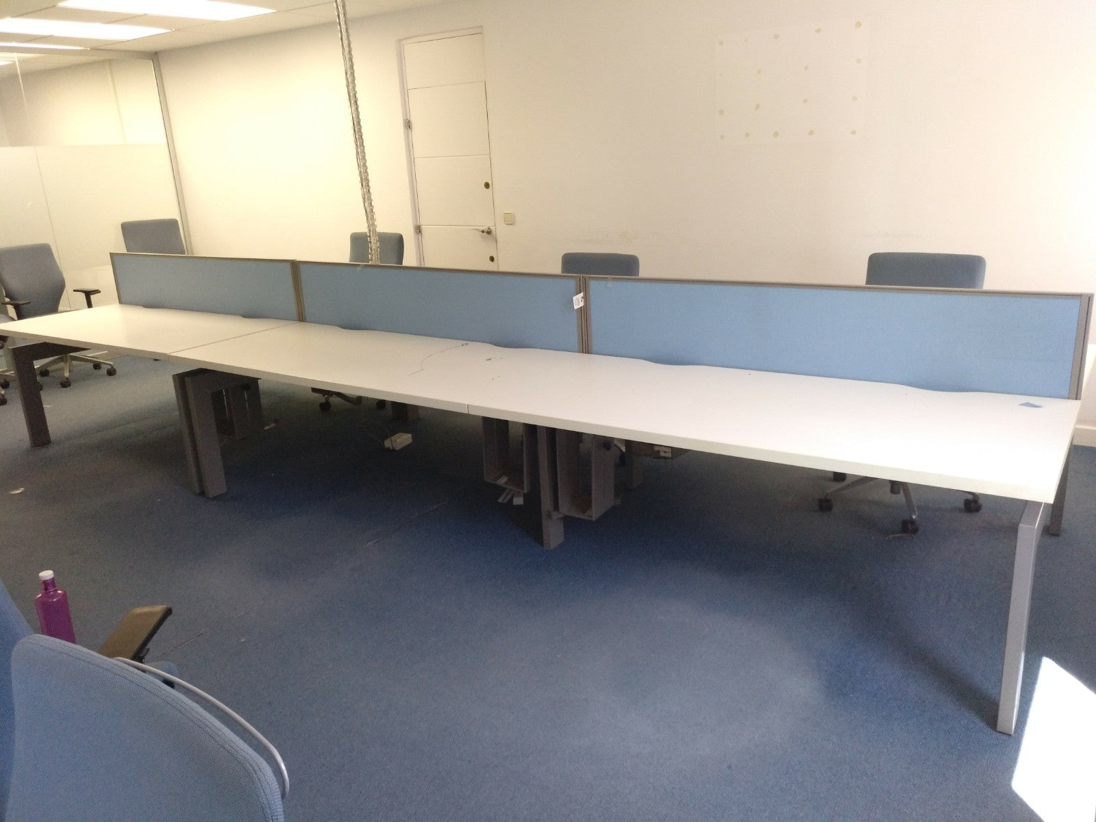 Compacto de 6 puestos enfrentados, de 1800x800 cada puesto, dando un total de 5400x1600, formada por encimera de color blanco de 30 mm de espesor, estructura metálica y separadores frontales tapizados en tela azul.