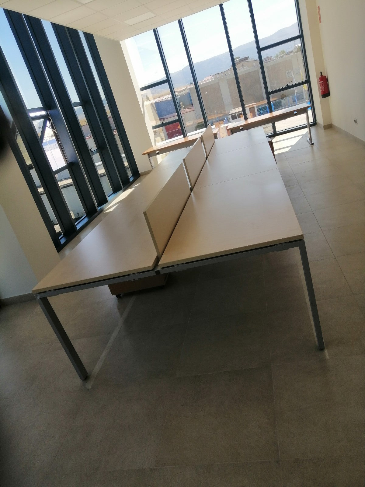 Compacto de 6 puestos enfrentados (3+3), encimera color maple y estructura metálica, EL PRECIO SOLO INCLUYE LOS 6 PUESTOS DE TRABAJOS Y SEPARADORES, SILLAS NO INCLUIDA Y CAJONERA NO INCLUIDA (precio de cajonera es 45 euros unidad).