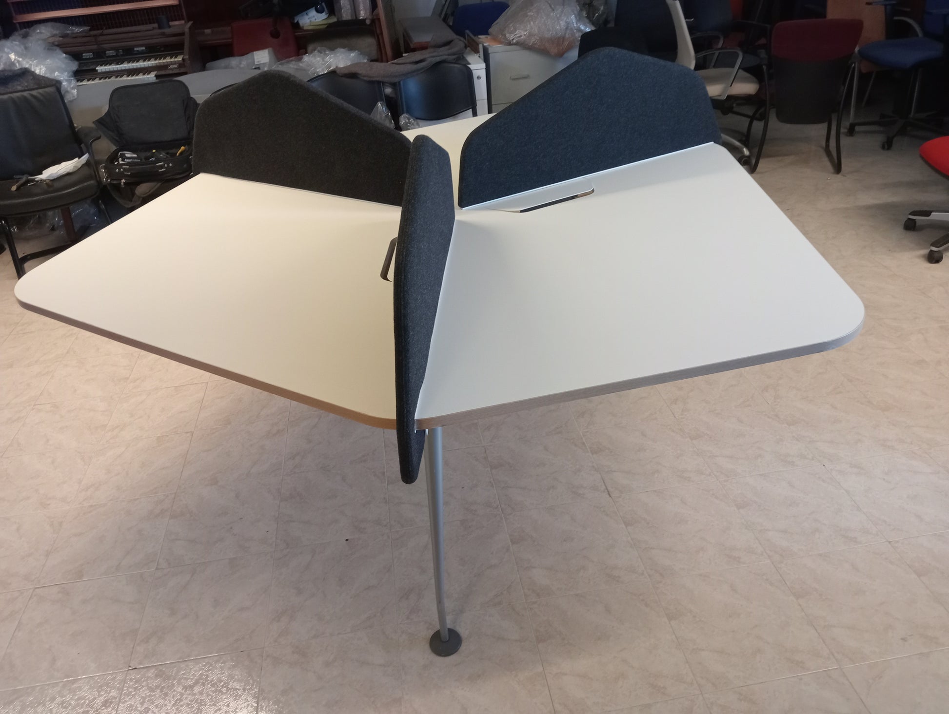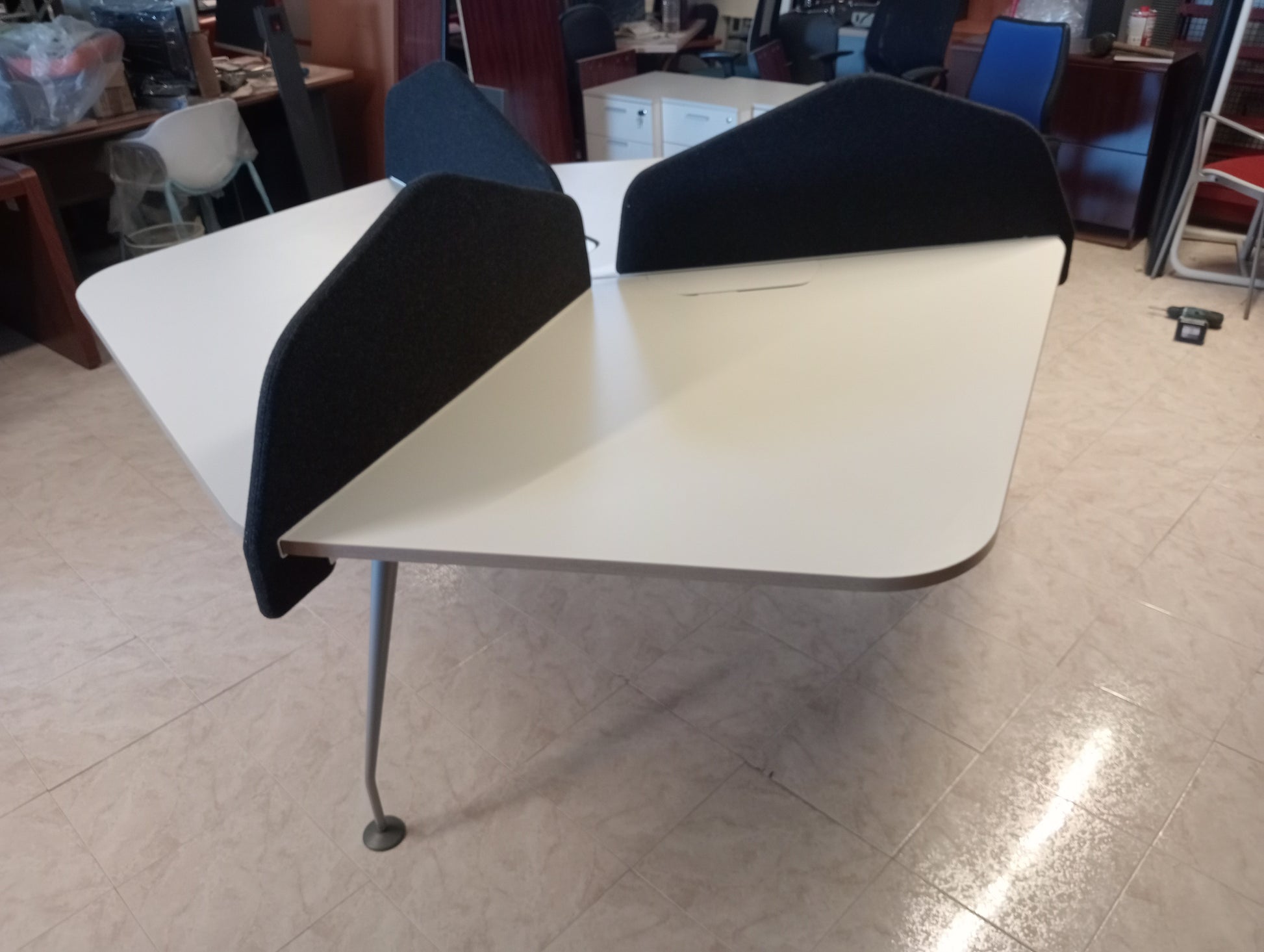 Compacto de 4 puestos, con una medida total de 2400x2400, encimera y estructura metálica color blanco, separadores tapizados en tela gris oscura, tapetas pasacables rectangulares.