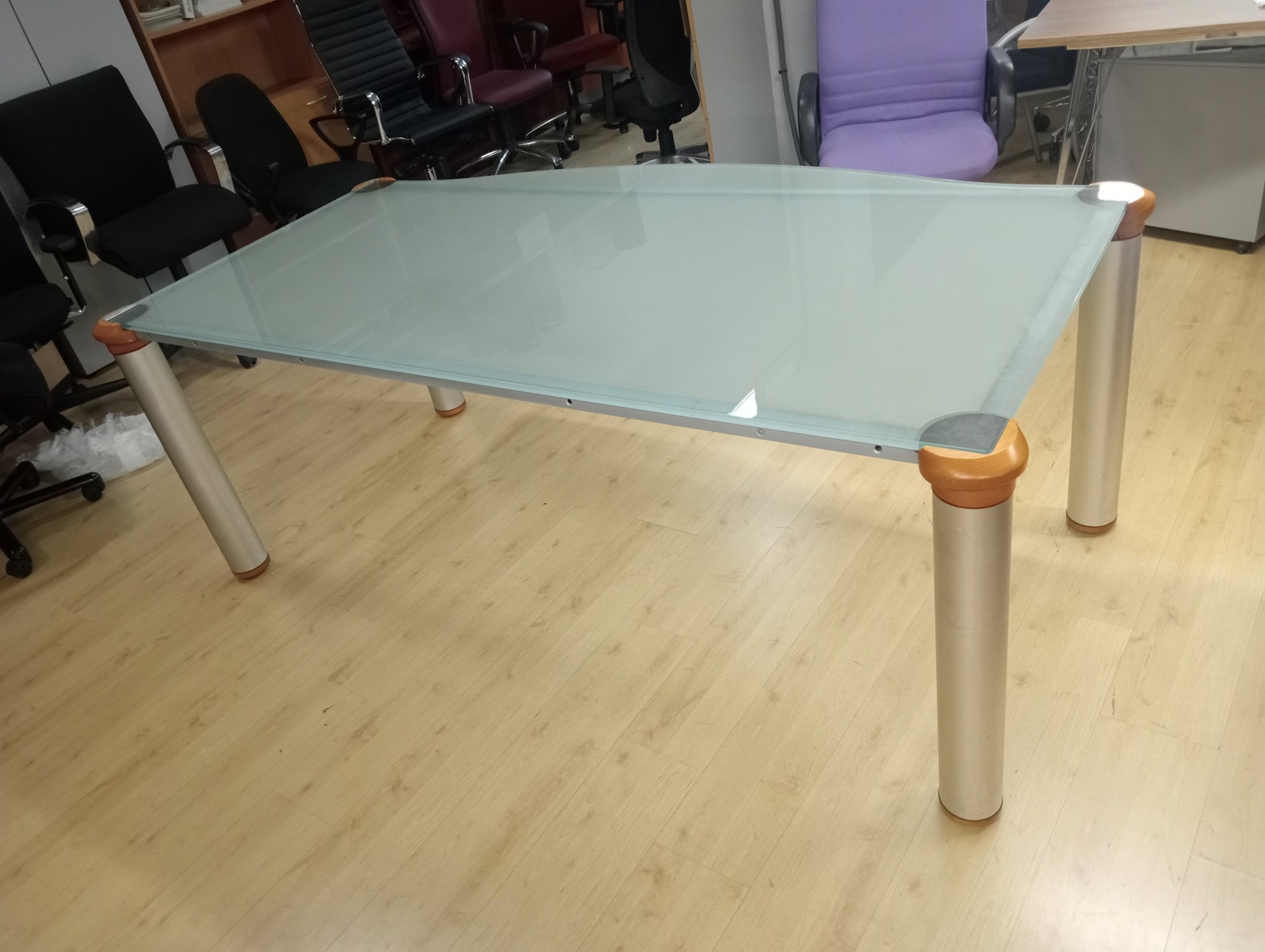 Despacho formado por mesa de dirección de 2000x1030, con encimera de cristal, estructura perimetral metálica con 4 patas tubulares pintadas en epoxi gris plata y estantería a juego de 1800 de altura, 1200 de ancho y 480 de fondo.