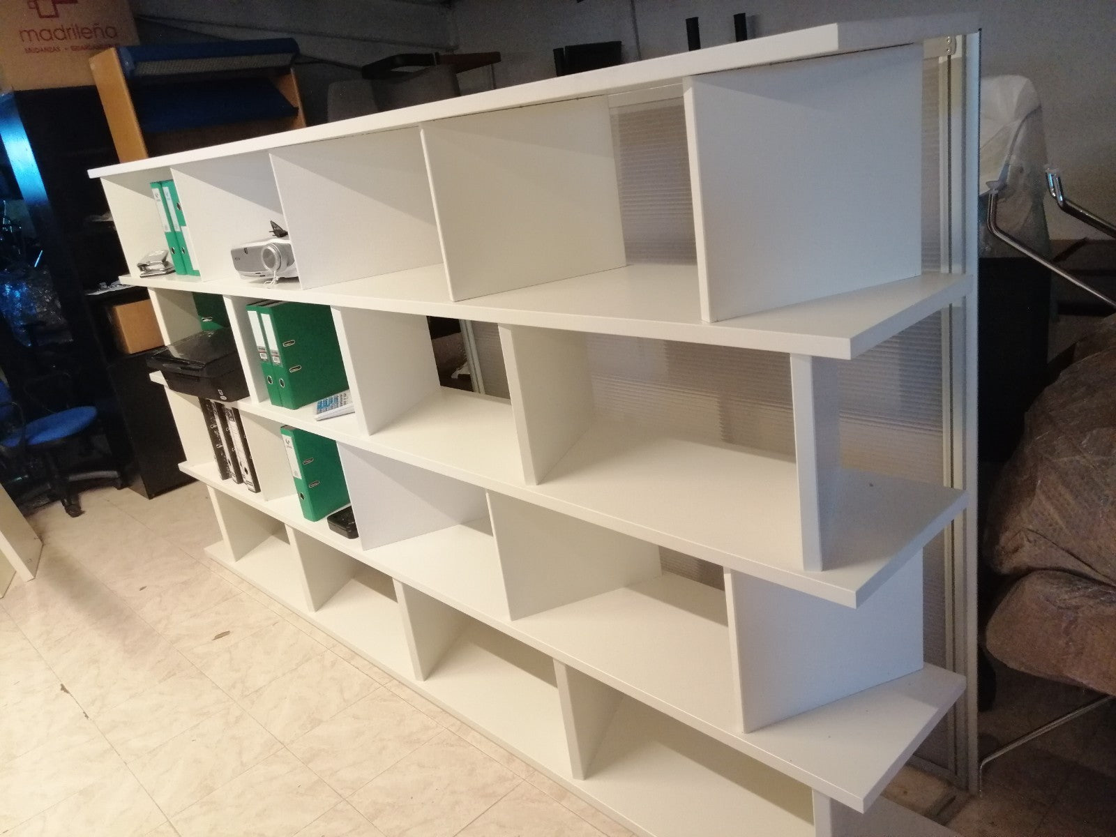 Estantería de 3000 de longitud, 1630 de altura y 400 de fondo, fabricada en DM lacada en blanco de 30 mm de grosor.