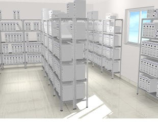 Estantería metálica de ángulo ranurado, perfiles y estantes metálicos pintados en epoxi.