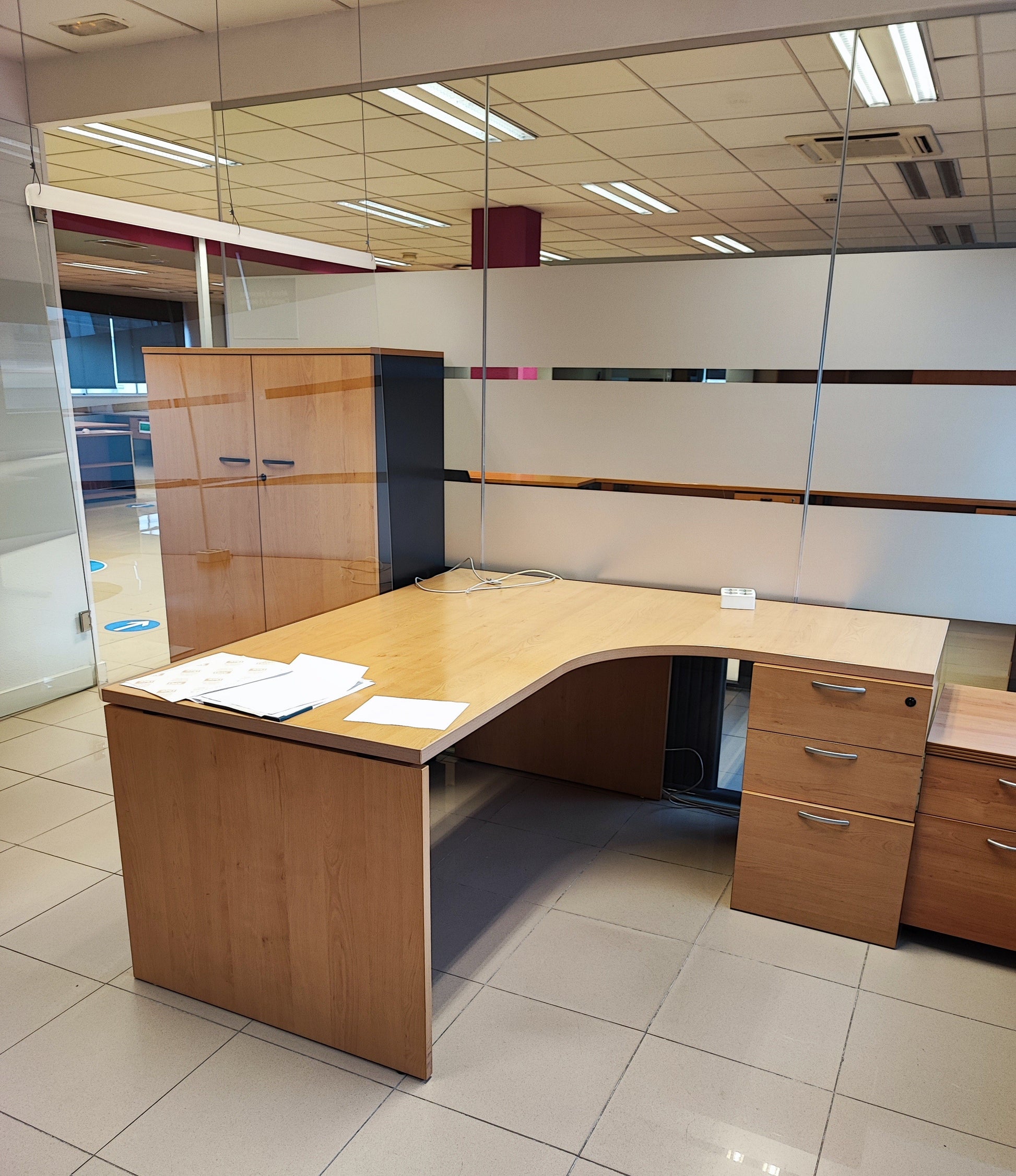 Mesa angular de 1600x1200, formada por encimera y patas fabricadas en melamina color haya, cajonera de pedestal a juego.
