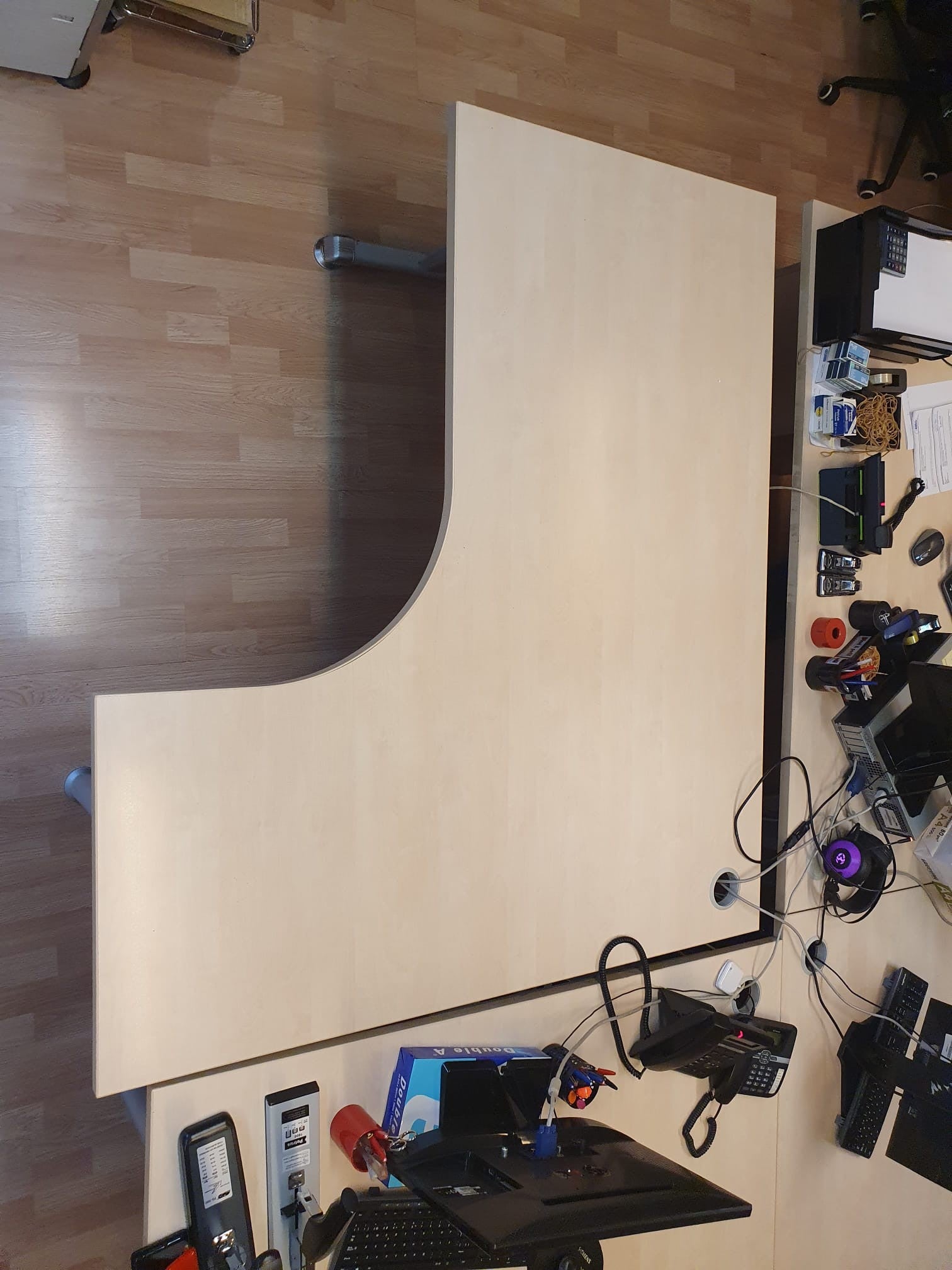 Mesa angular, formada por encimera fabricada en tablero bilaminado color maple, canteada en pvc, estructura metálica gris, disponible en las siguientes medidas: