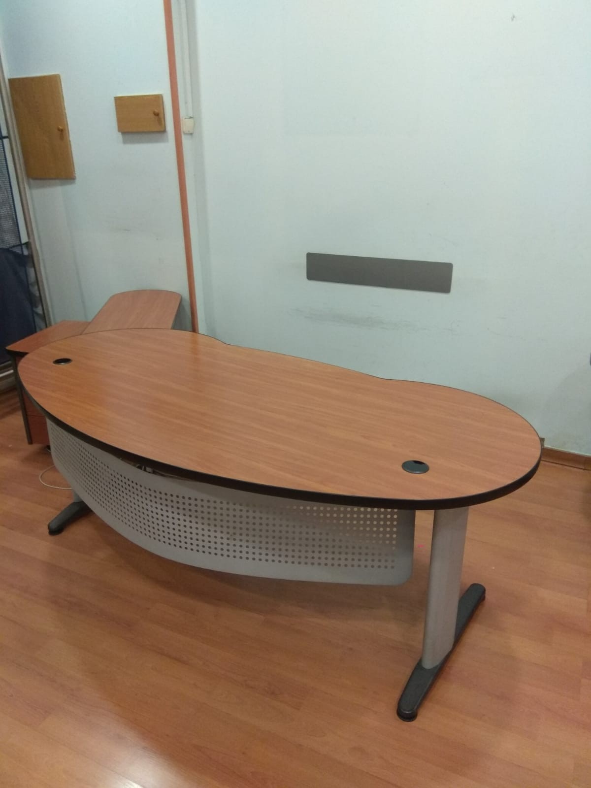 Mesa media luna, formada por encimera de melamina color cerezo, estructura metálica y faldón metálico, buck de ruedas a juego, armarios medios a juego uno con archivador en la parte inferior y otro armario con puertas de cristal.