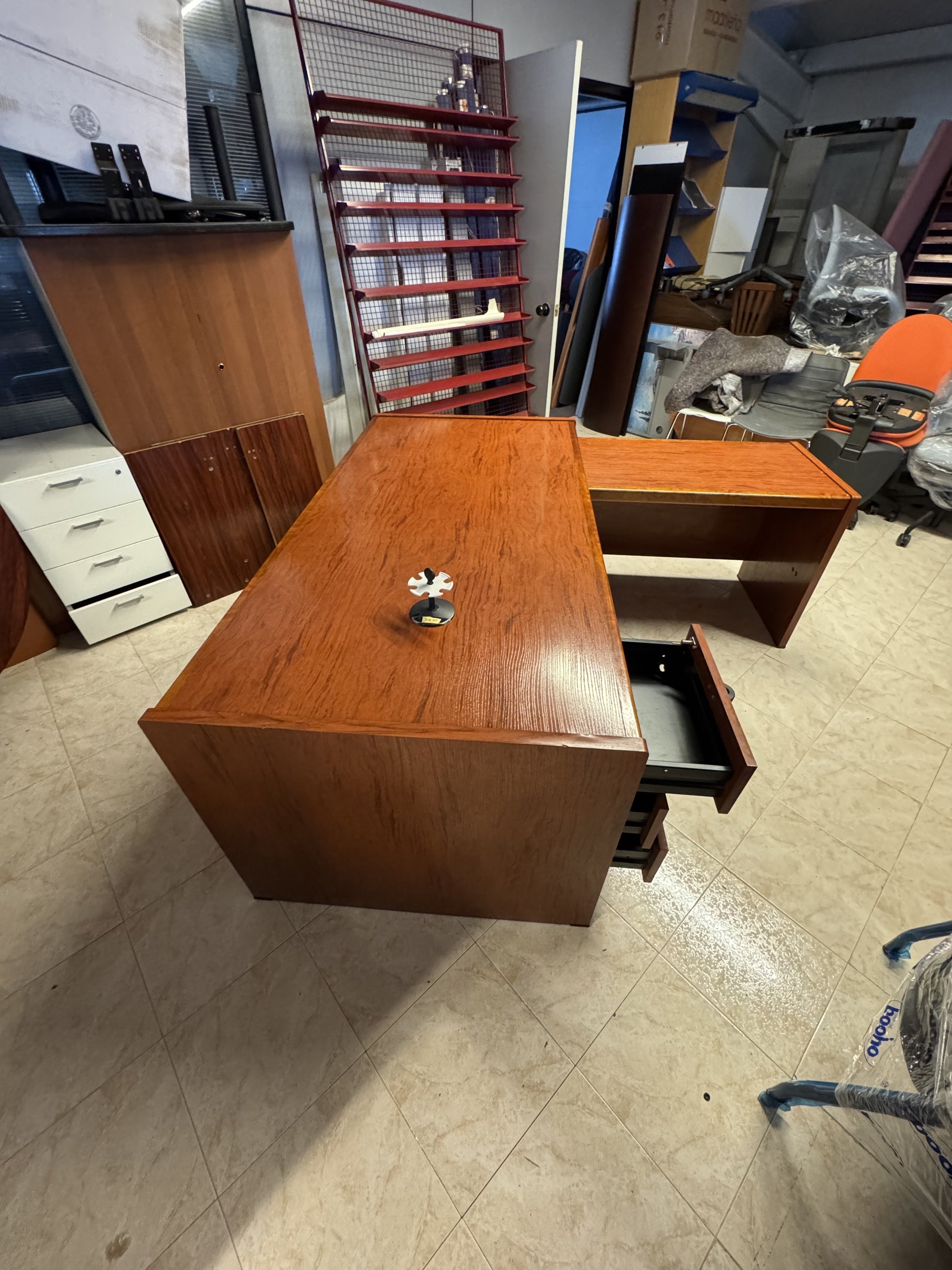 Mesa de dirección de 1800 de longitud, con ala auxiliar la medida total sería 1800x1860, encimnera y patas de melamina color nogal, cajonera colgada a juego.