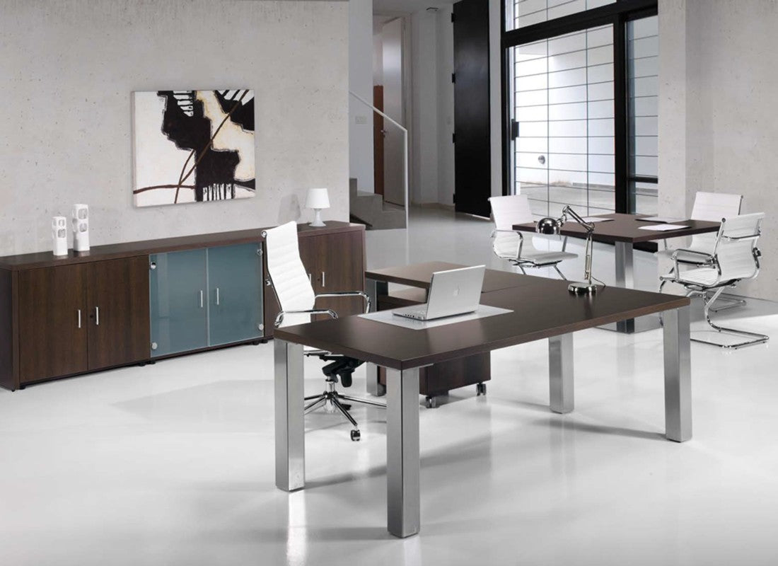 Mesa de dirección formada por encimera de 40 mm de espesor y patas metálicas. Faldón, ala y buck de ruedas no incluidos en los precios (opcionales). Precio de complementos en descripción de mesa.