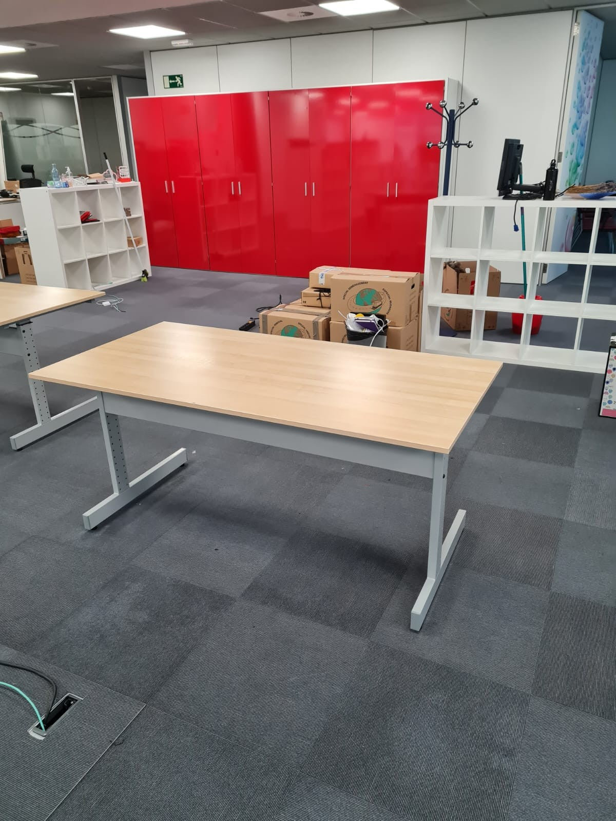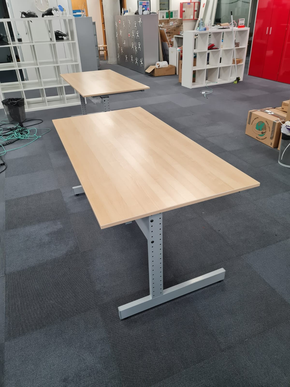 Mesa recta de 1600x800, encimera de melamina color haya, estructura metálica color gris plata.