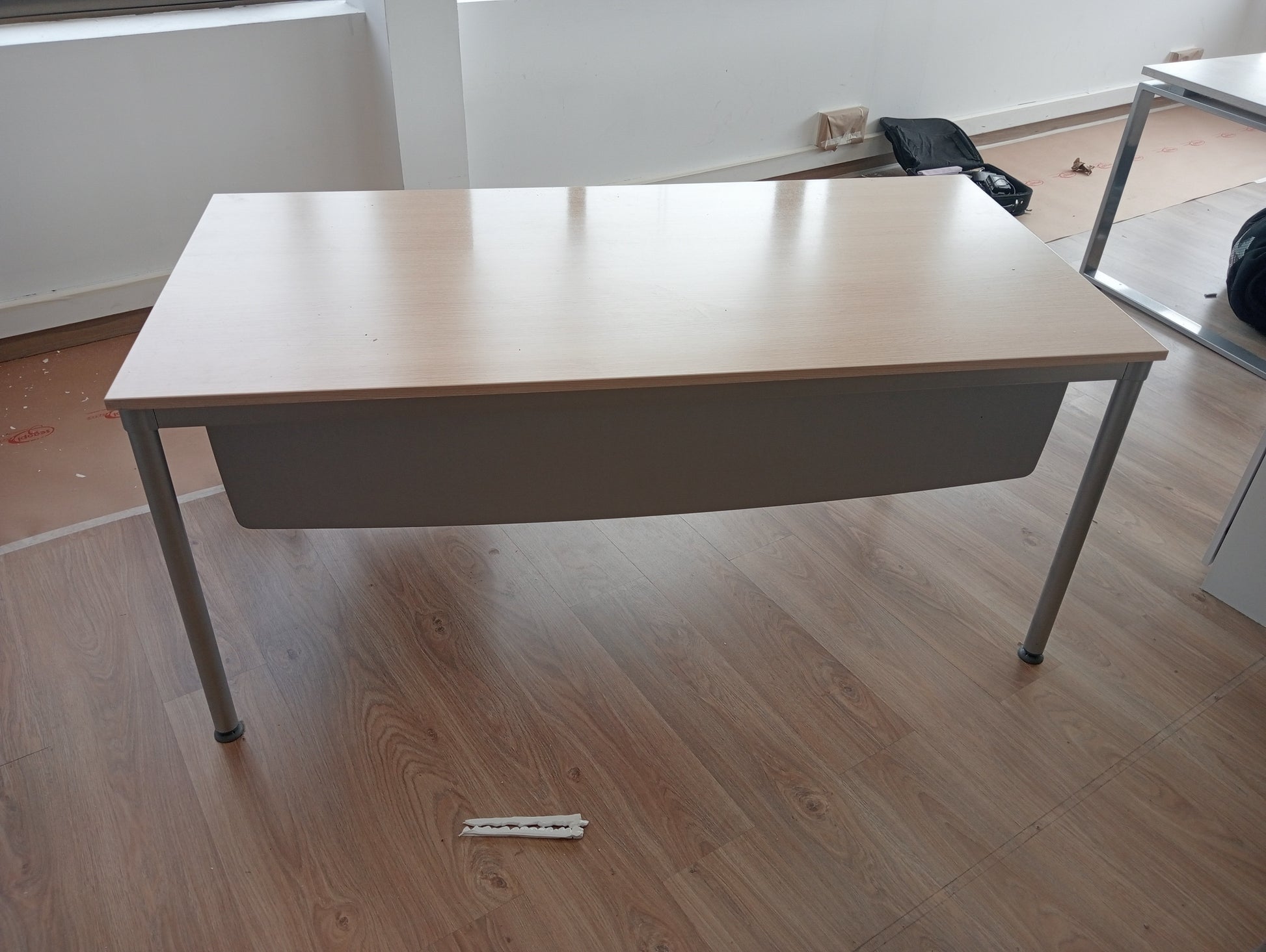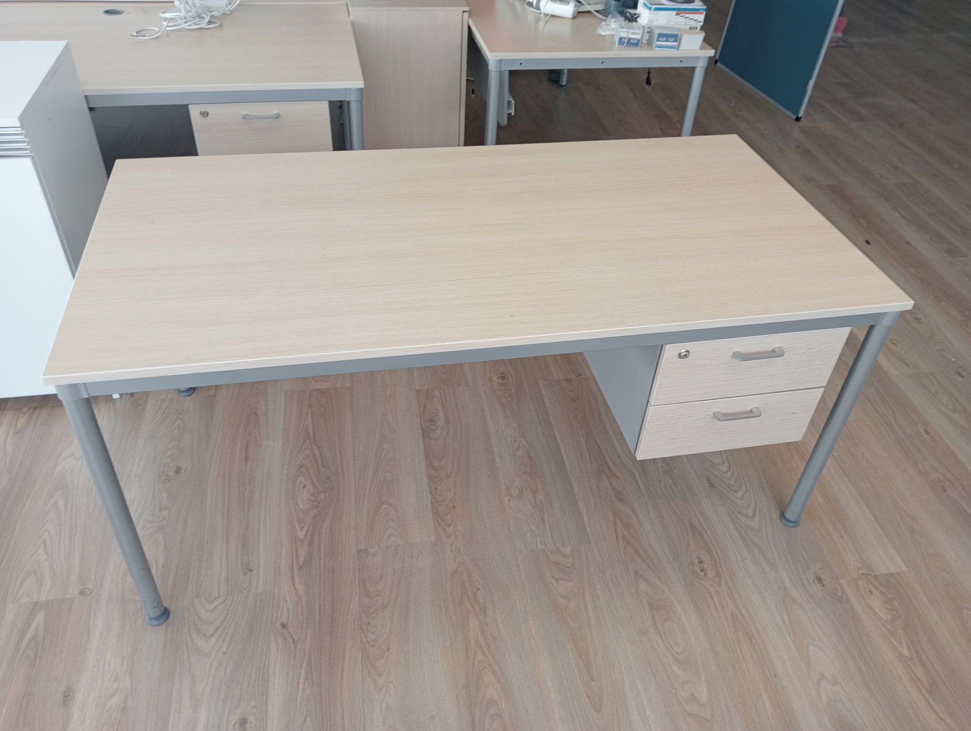 Mesa recta de 1600x800, encimera de melamina color haya, estructura metálica, faldón, cajonera de 2 cajones a juego colgada, marca ACTIU.