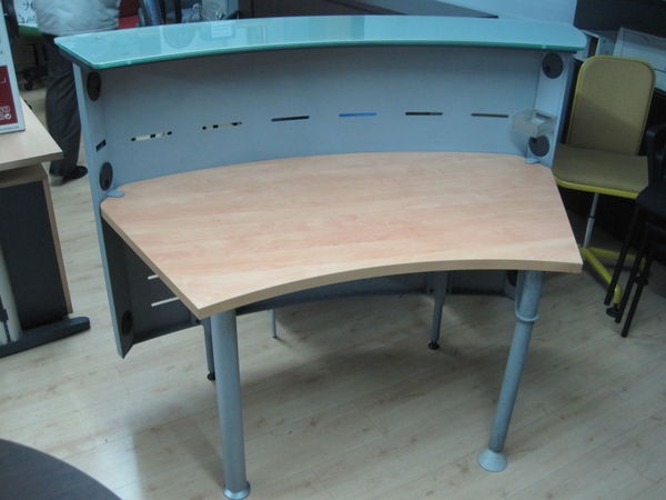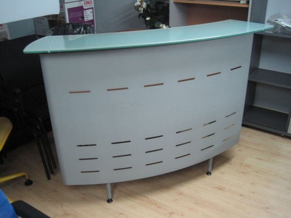 Mostrador curvo de 1140 de altura, 1520 de ancho, con frente metálico pintado en epoxi gris aluminio, encimera de mostrador de cristal y sobre de trabajo de melamina de 30 mm de grosor de color peral de 1330 de ancho y 670 de fondo.