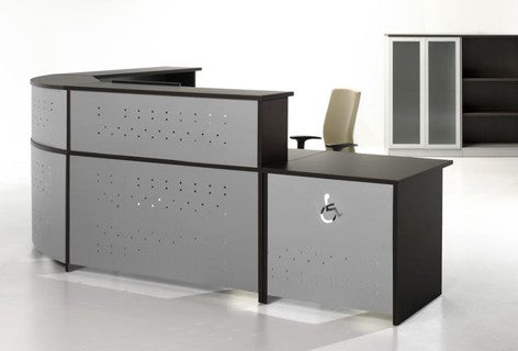 Mostrador formado por mesa con altillo formado por partes rectas y curvas con frente de mostrador metálico o de madera (opcional).