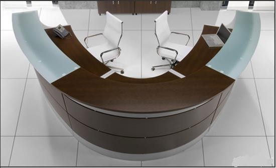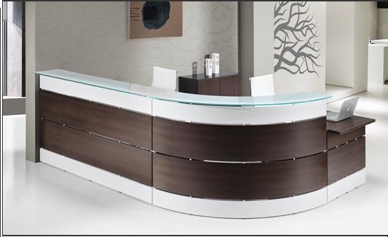 Mostrador formado por encimera de mostrador de cristal, frentes de mostrador fabricado con tablero bilaminado.