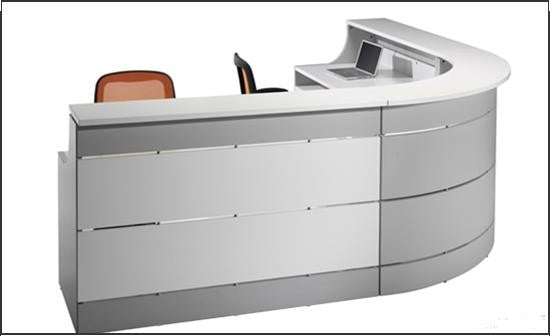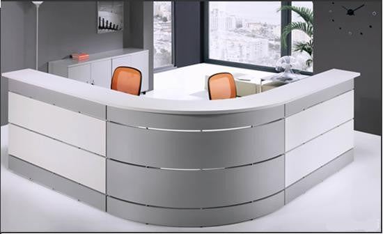 Mostrador formado por tapa de mesa de tablero bilaminado de 30 mm de grosor, frontal del mostrador de paneles bilaminados de 19 mm de espesor, encimera de melamina. Combinación de colores: laterales y dos de los cuatro frentes siempre en color gris perla.