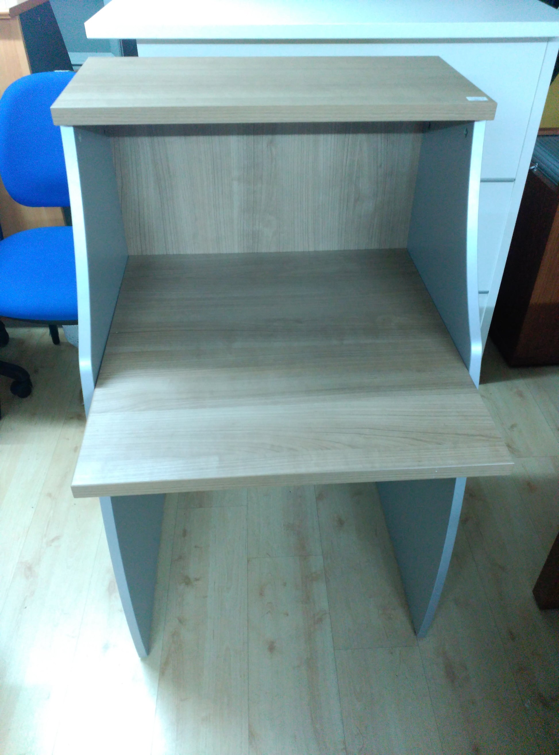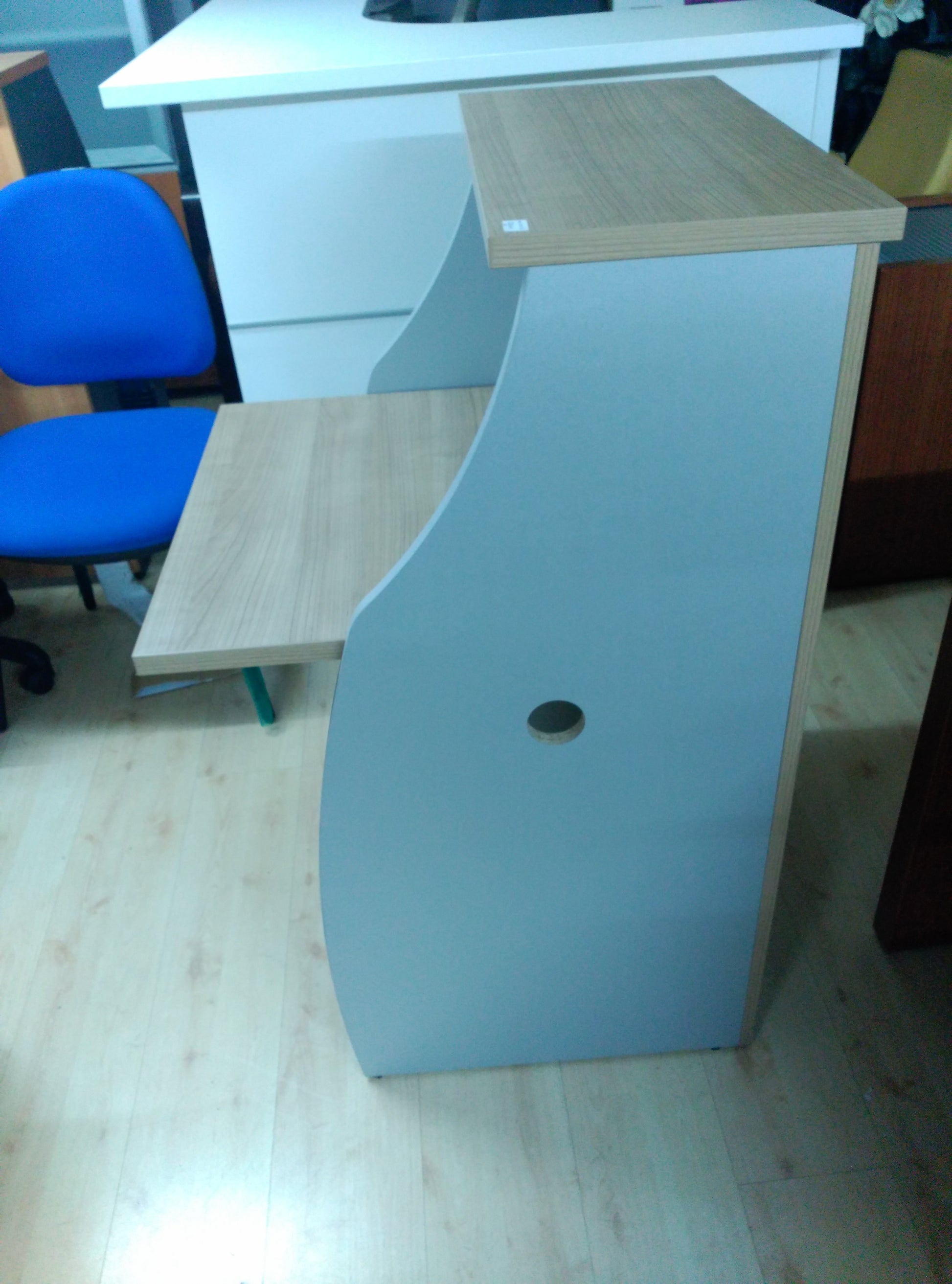 Mostrador recto de 1100 de altura, 640 de ancho y 670 de fondo, con sobre de mesa, encimera y frente de mostrador de color cerezo, laterales en color plata.
