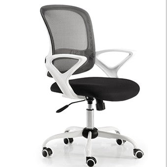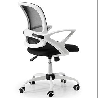 Silla giratoria formada por respaldo de malla de alta resistencia, terminación negro, asiento tapizado en "nido de abeja" y goma espuma de alta densidad, carcasa de nylon color blanco, mecanismo basculante, tensor de control de presión, brazos fijos integrados en estructura, base de acero pintado en blanco.