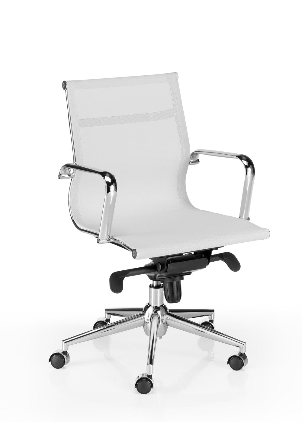 Sillón de dirección con respaldo bajo y asiento en malla de alta resistencia color negra o blanca, basculante lux con fijación en 4 posiciones, tensor de control de presión, estructura de tubo de acero cromado, base cromada.