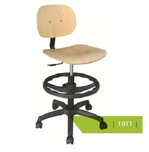 Taburete formado por asiento y respaldo de madera de haya, elevación por pistón de gas, aro reposapiés.